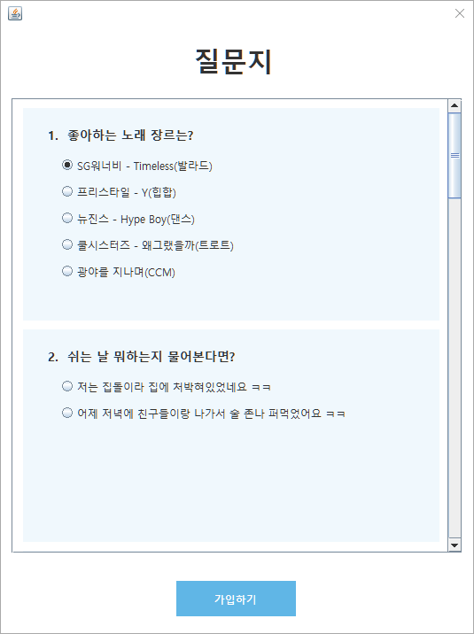 : 회원가입시 자신의 성향에 대한 간단한 질문에 답을 작성하여 데이터 구축