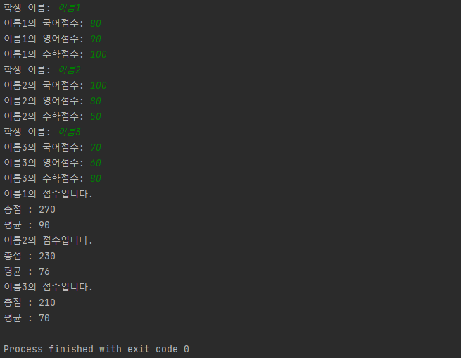 (2) 3명의 학생 점수의 총합, 평균을 콘솔로 출력하기