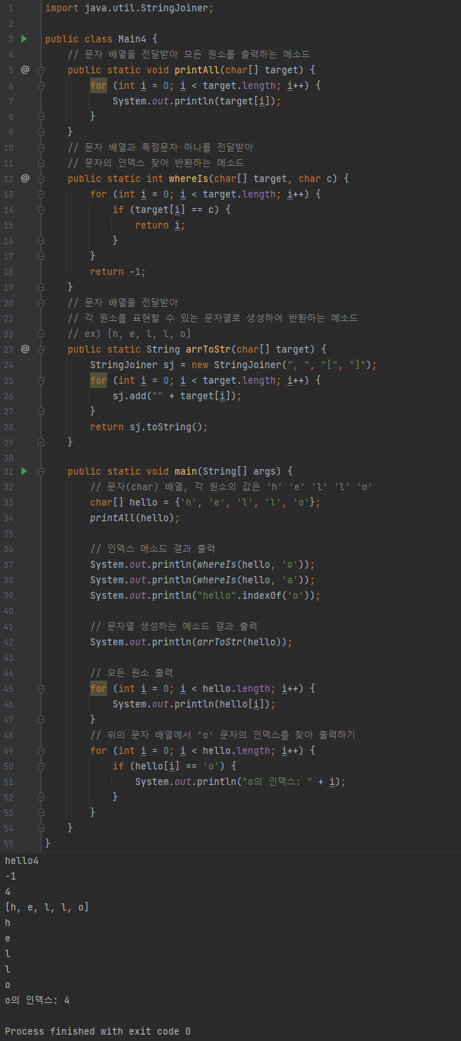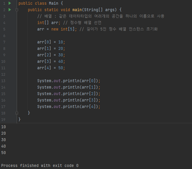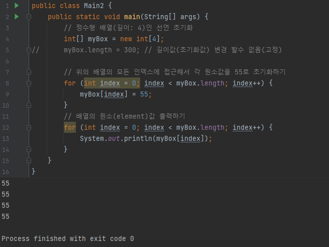 배열은 생성과 동시에 자동적으로 자신의 타입에 해당하는 기본값으로 초기화되므로 배열을 사용하기 전에 따로 초기화를 해주지 않아도 되지만, 원하는 값을 저장하려면 각 요소마다 값을 지정해줘야한다.