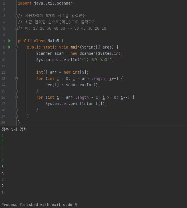 사용자에게 5개의 정수를 입력받아 최근 입력한 순으로(역순) 출력하기