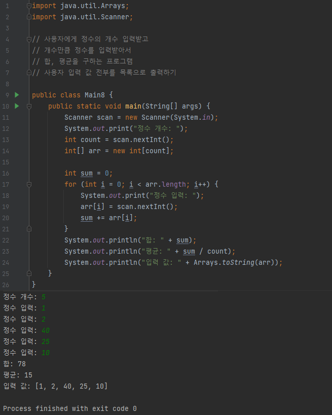 사용자에게 정수의 개수를 입력받고 개수만큼 정수를 입력받아서