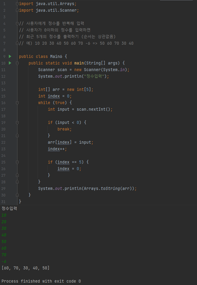 사용자에게 정수를 반복해 입력받고, 0이하의 정수를 입력하면 최근 5개의 정수를 출력하기