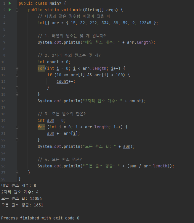 배열의 원소 합, 평균 구하기