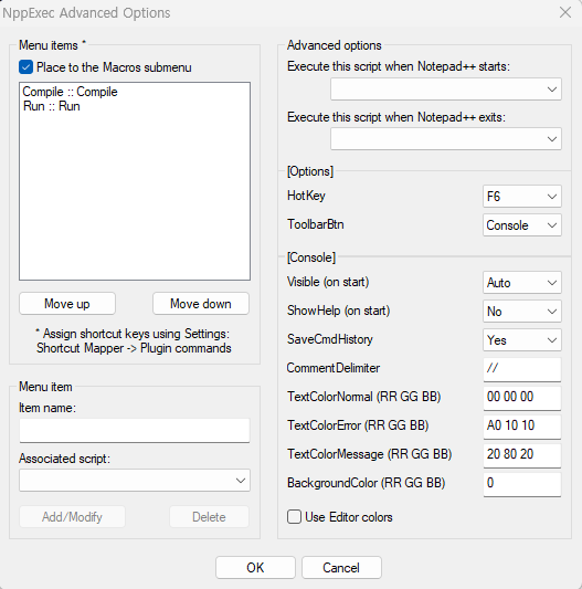 Add/Modify 클릭하면 Menu items에서 Compile이 생성된다.