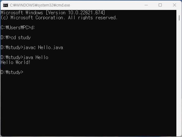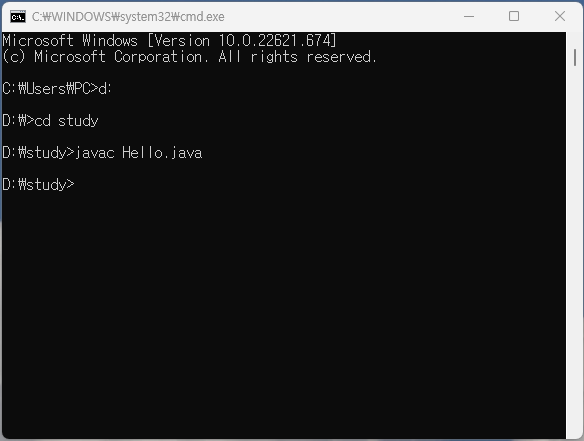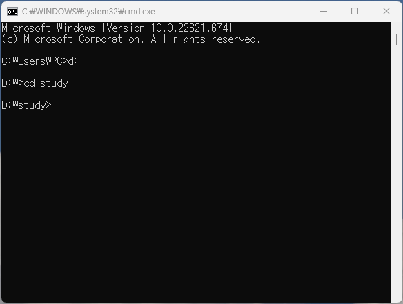 D에 study라는 폴더 안에 있으므로 "d:" 입력하여 D로 이동하기