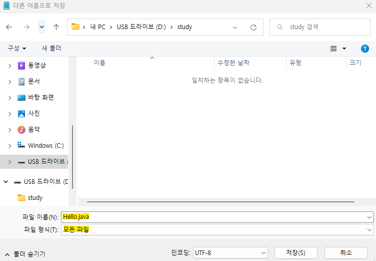 원하는 위치에 들어가서 파일형식을 모든 파일로 바꾸고 파일이름 "Hello.java" 입력하기