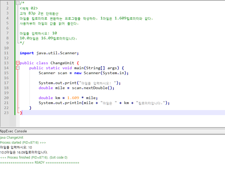 마일을 킬로미터로 변환하는 프로그램을 작성하라. 1마일은 1.609킬로미터와 같다.