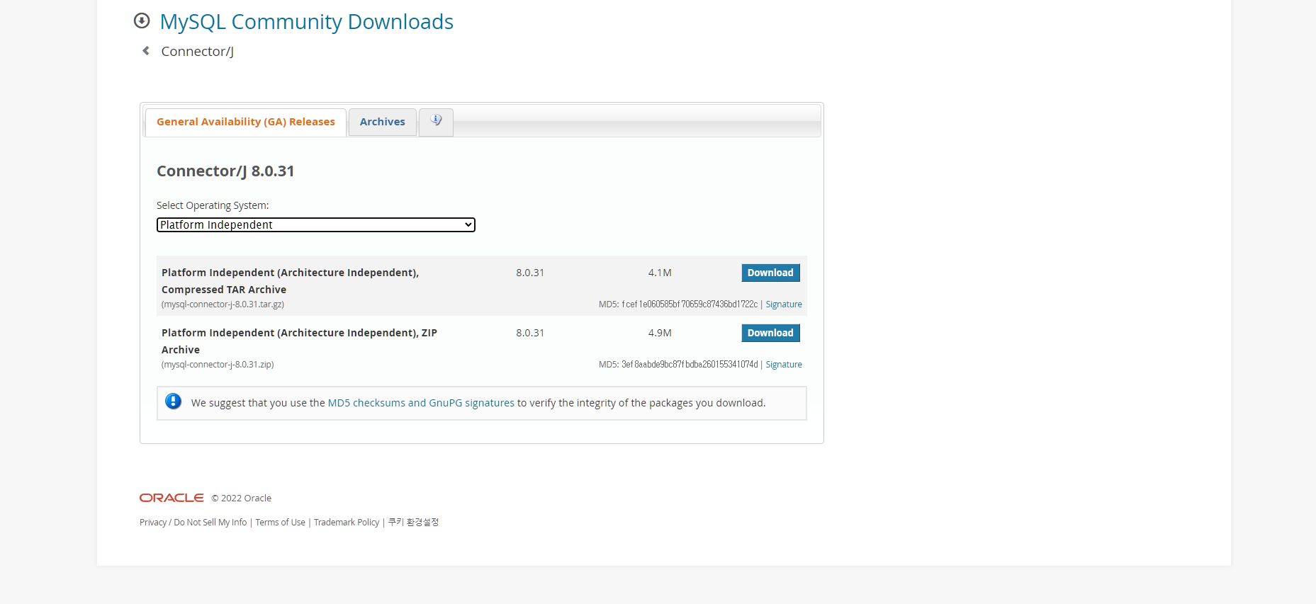 홈페이지 접속 > JDBC Driver for MySQL (Connector/J) > Platform Independent > Platform Independent (Architecture Independent), ZIP Archive Download > No thanks, just start my download.