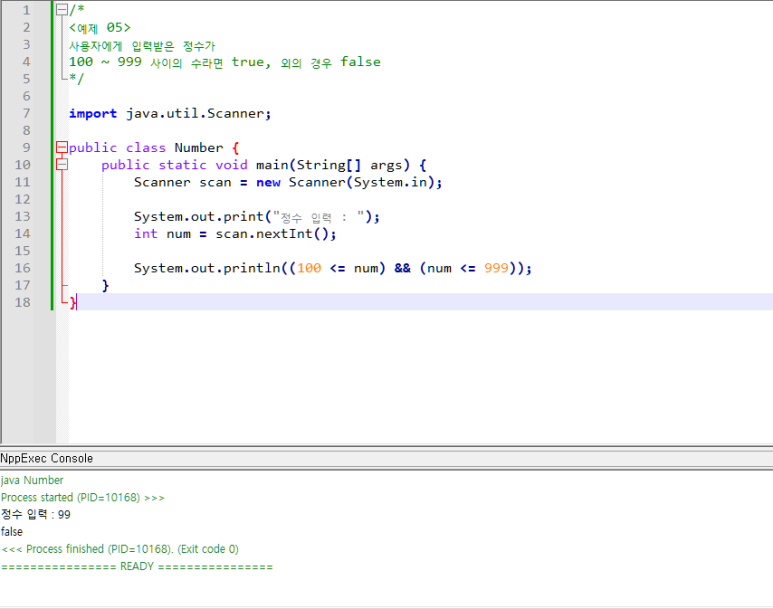 100 ~ 999 사이의 수라면 true, 외의 경우 false를 출력하기