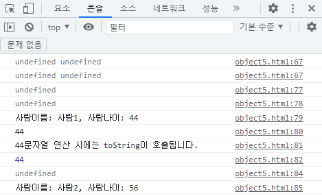 | valueOf() | 특정 객체의 원시 타입(primitive type)의 값을 반환한다. 자바스크립트에서는 원시 타입의 값이 기대되는 곳에 객체가 사용되면, 내부적으로 이 메소드를 호출하여 처리한다. |