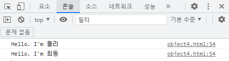 | hasOwnProperty() | 특정 프로퍼티가 해당 객체에 존재하는지를 검사한다. 해당 객체에서 직접 선언된 프로퍼티만을 검사하며, 같은 이름의 프로퍼티라도 상속받은 프로퍼티는 false 값을 반환한다. |