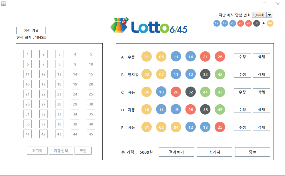 : 수동, 반자동, 자동 중 원하는 방법으로 로또 번호를 선택한 후, 당첨 번호와 비교하여 결과 확인. 게임 회차별 전적 보기 기능.